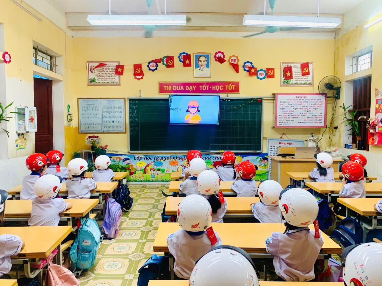 GVCN hướng dẫn các em học sinh đội mũ bảo hiểm.